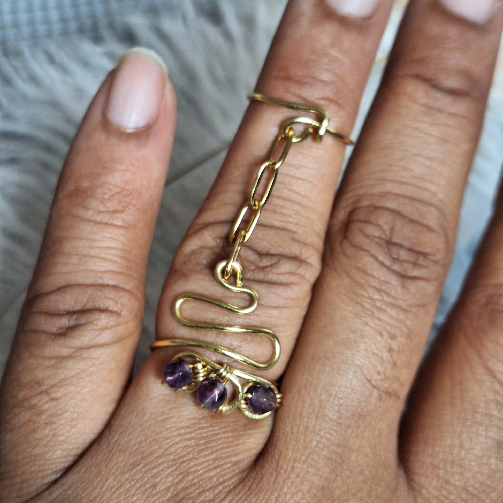 Este hermoso anillo está alambrado en latón y cuenta con un diseño espectacular. Acompañado de una cadena en Stainless Steel chapada en oro y un anillo adicional, es el complemento ideal para lucir sofisticada y con estilo.