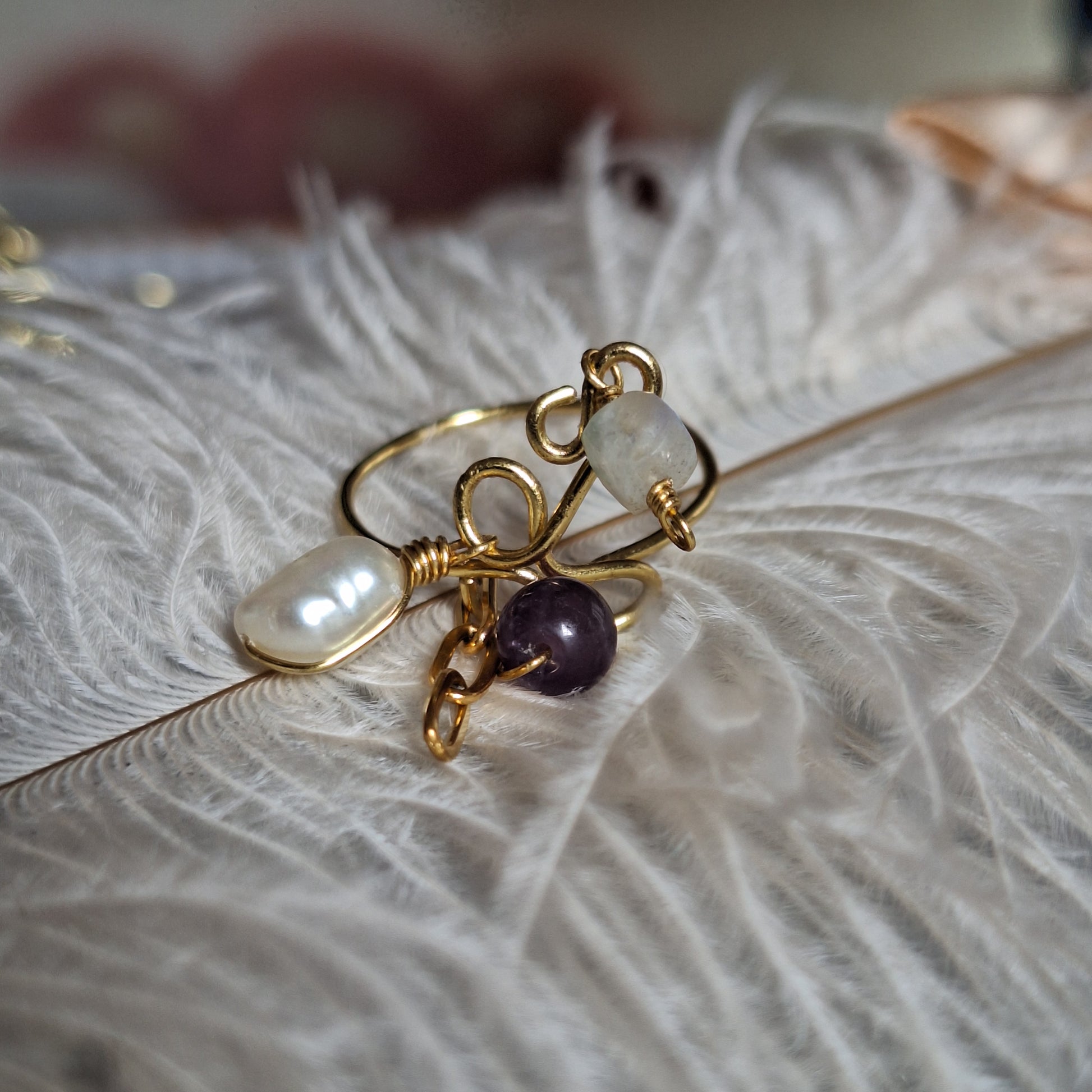 Expresa tu estilo único con nuestro anillo alambrado. El diseño exclusivo en latón y las piedras de amatista y piedra lunar, junto con la perla y cadena chapada en oro, agregan un toque de lujo y sofisticación a cualquier atuendo.