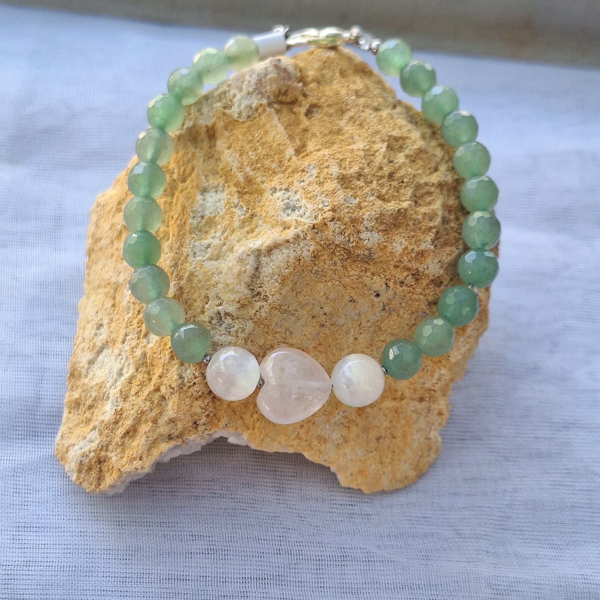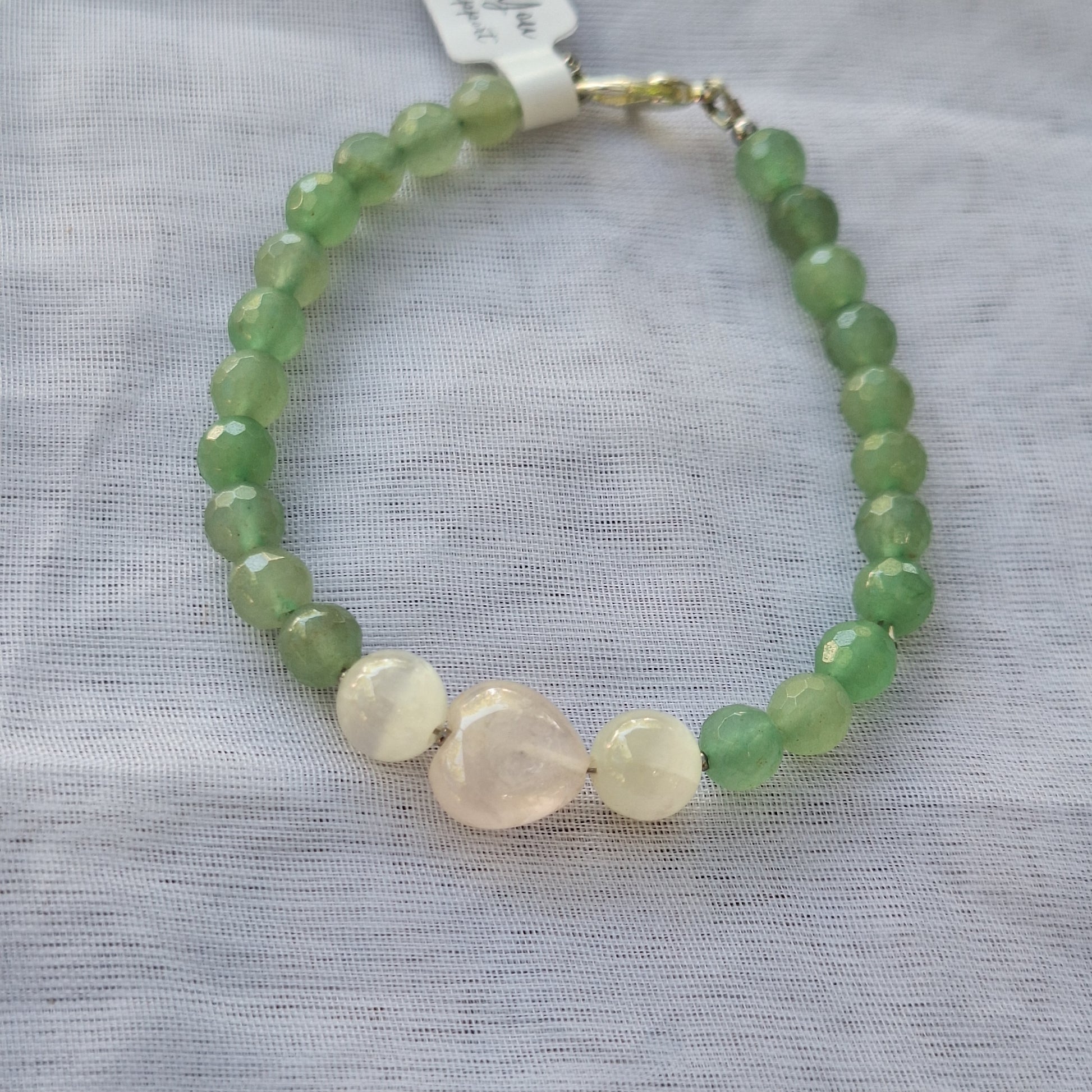 Disfruta de la belleza y propiedades curativas de la Aventurina, Selenita y Cuarzo Rosa en esta pulsera combinada. La Aventurina brinda buena suerte, la Selenita purifica y el Cuarzo Rosa aporta amor y paz interior. Una combinación perfecta para mejorar tu bienestar