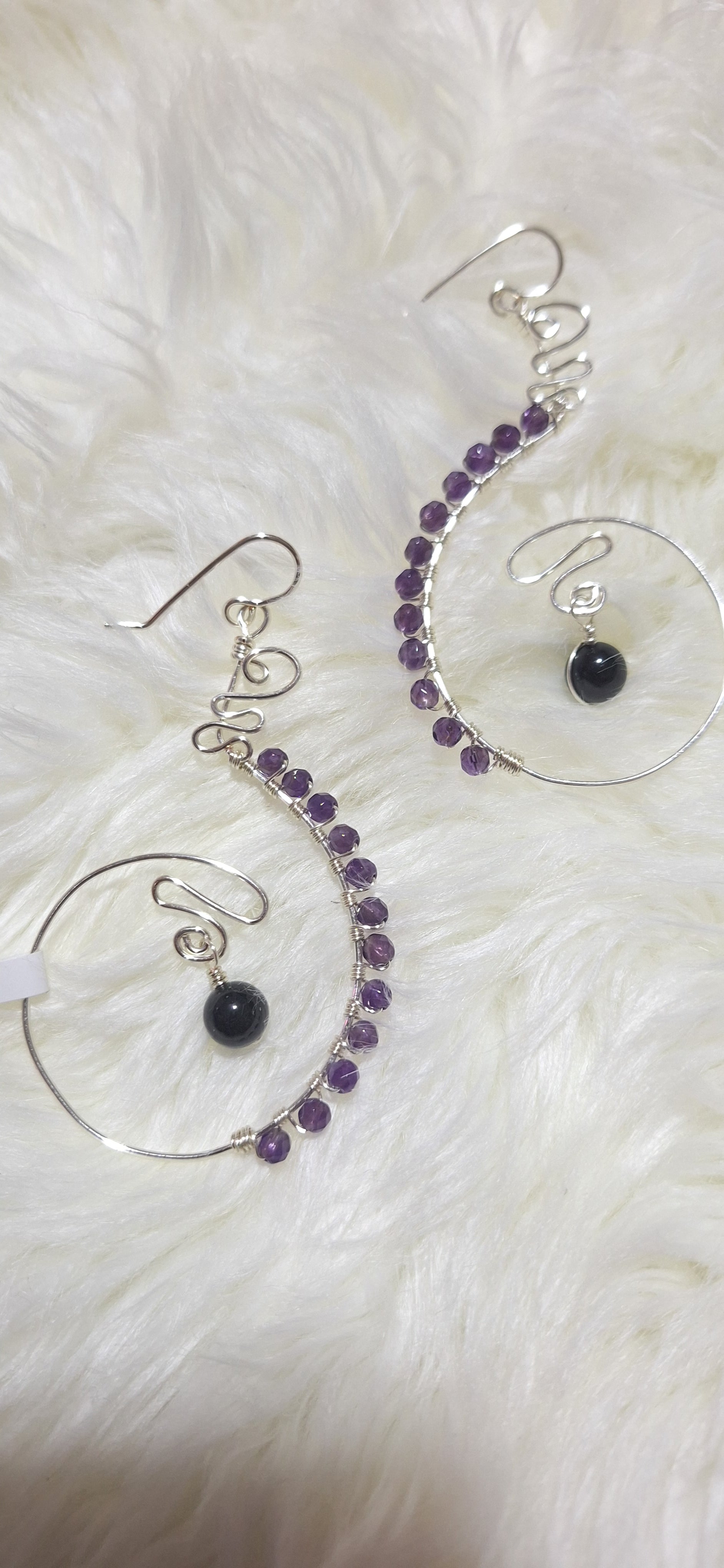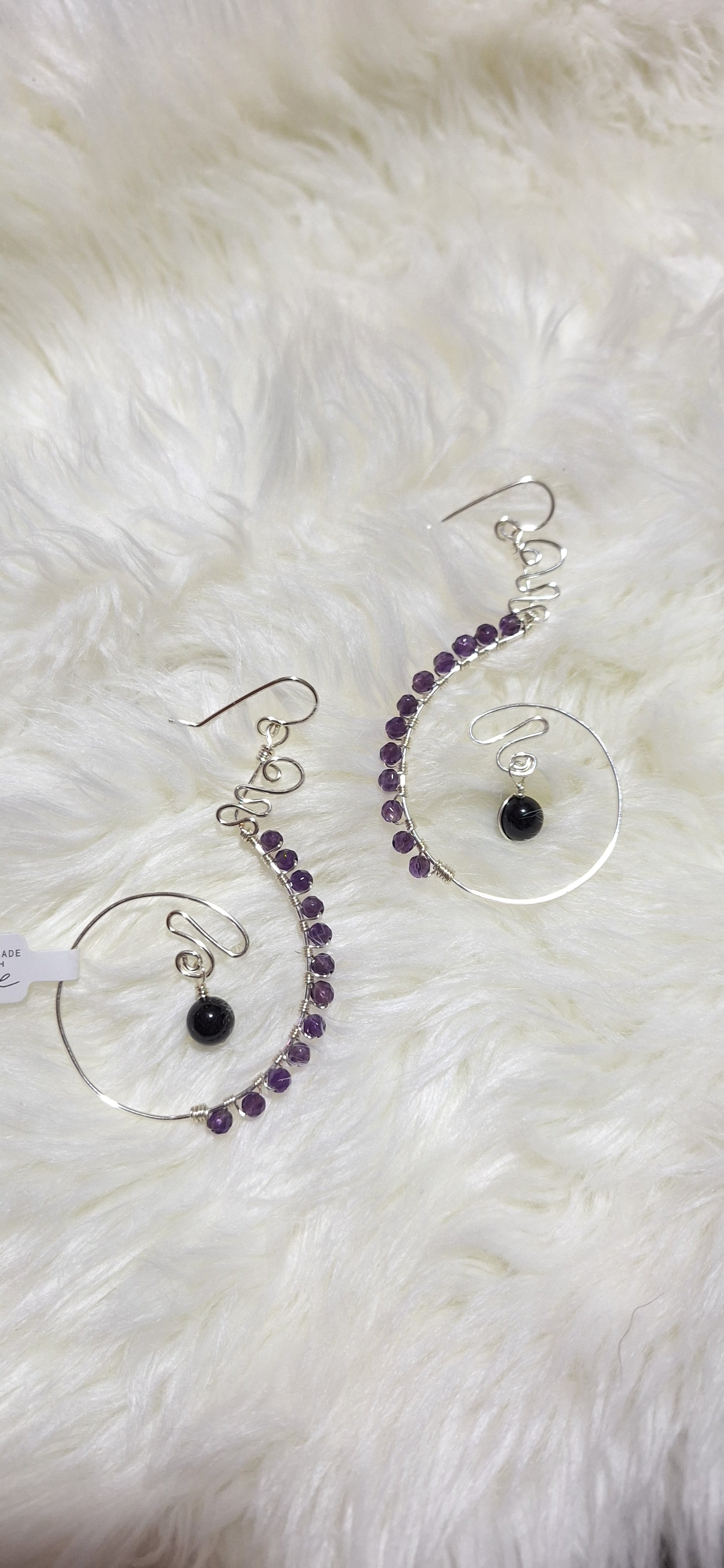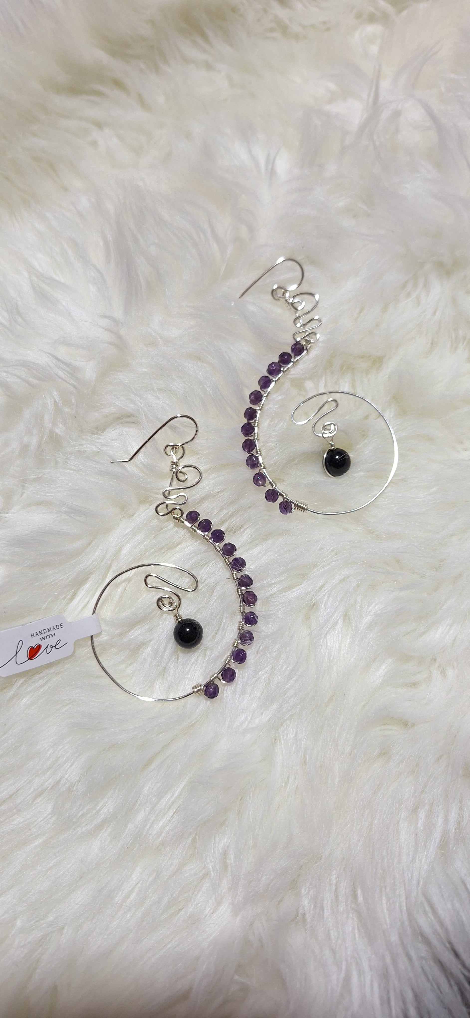 Descubra la belleza de nuestras Pantallas Alambrada Amatista. Estas Aretes Artesanales están echas en cobre y chapadas en plata 925, con un diseño único y elegante. Las piedras de cuarzo amatista y turmalina negra, tejidas a mano, forman una combinación perfecta para crear un estilo exclusivo y sofisticado.