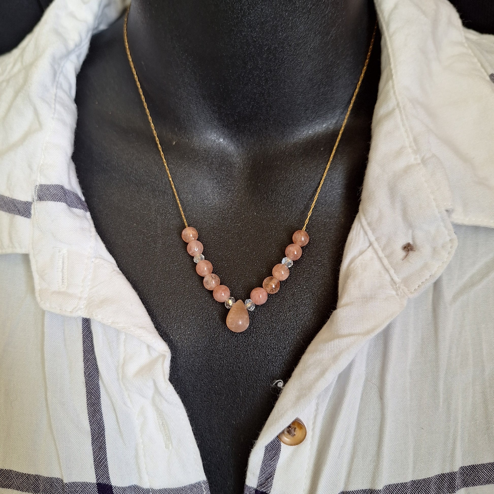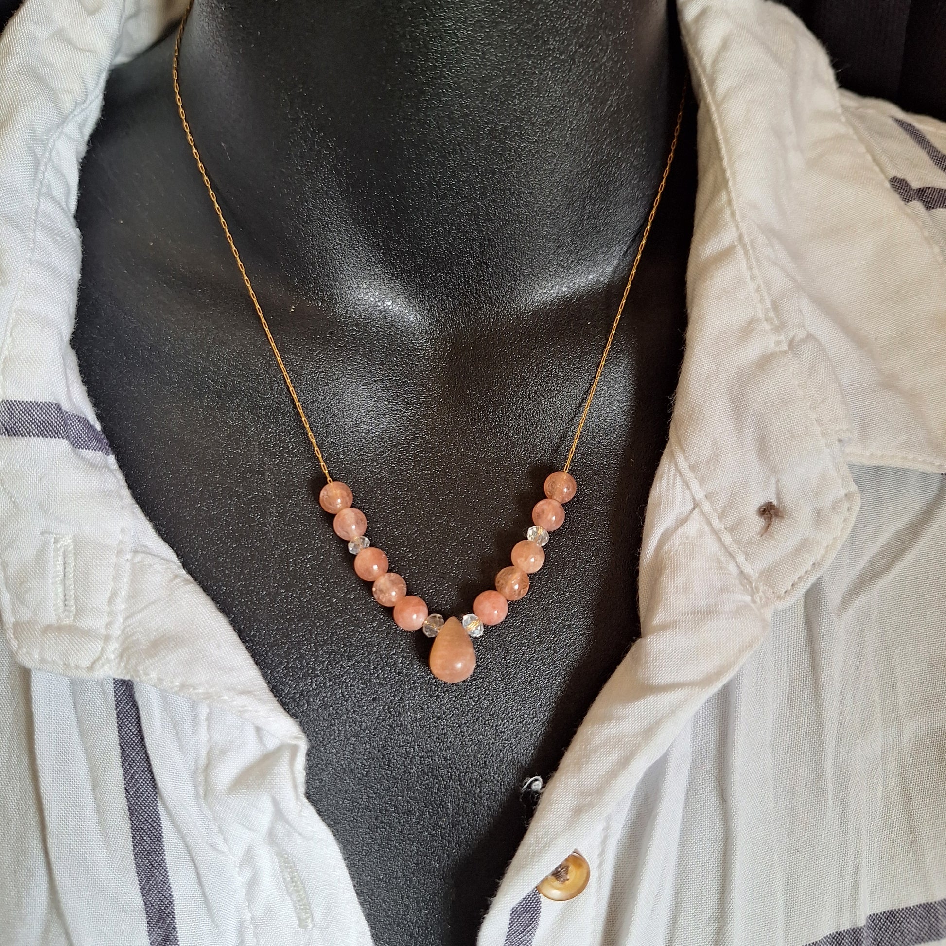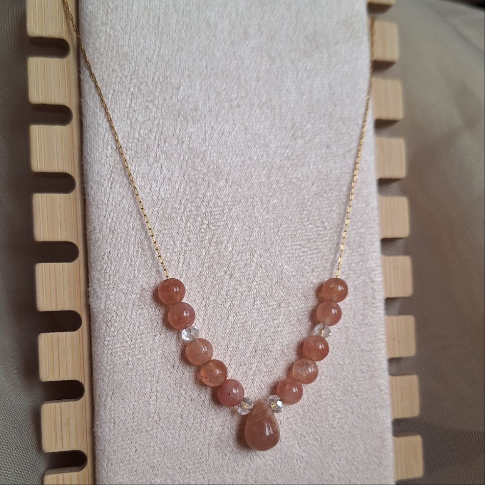 Sorprende con este elegante collar de piedra lunar. El collar dorado de acero inoxidable con piedra lunar de melocotón te hará destacar en cualquier ocasión. Agrega un toque de brillo natural a tu atuendo con esta pieza única.