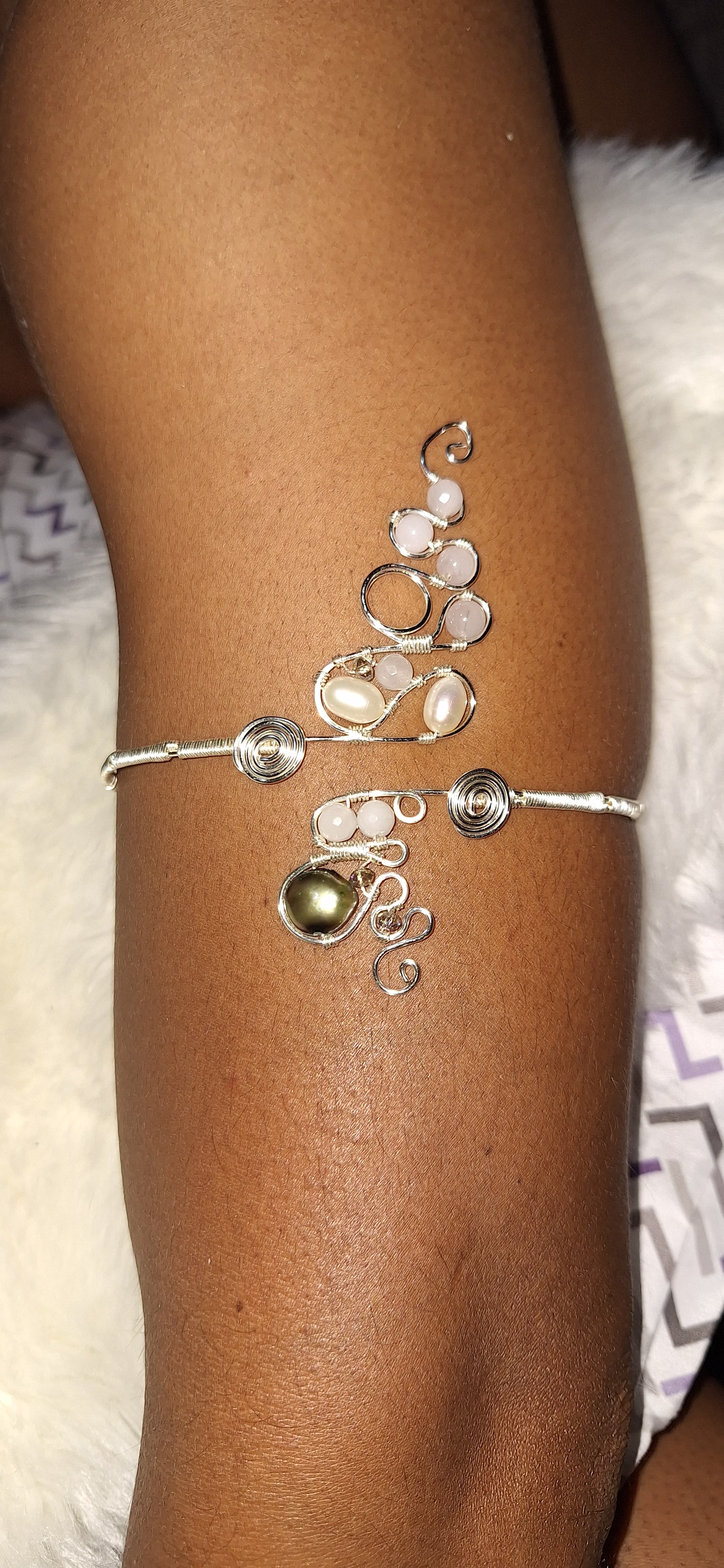 La Pulsera Alambrada es una elegante pieza hecha con cuarzo rosa y perlas, perfecta para lucir en la parte superior del brazo. Fabricada en cobre enchapado en plata 925, esta pulsera es duradera y resistente, brindando un toque sofisticado a cualquier atuendo. Mejora tu estilo con esta pulsera única.