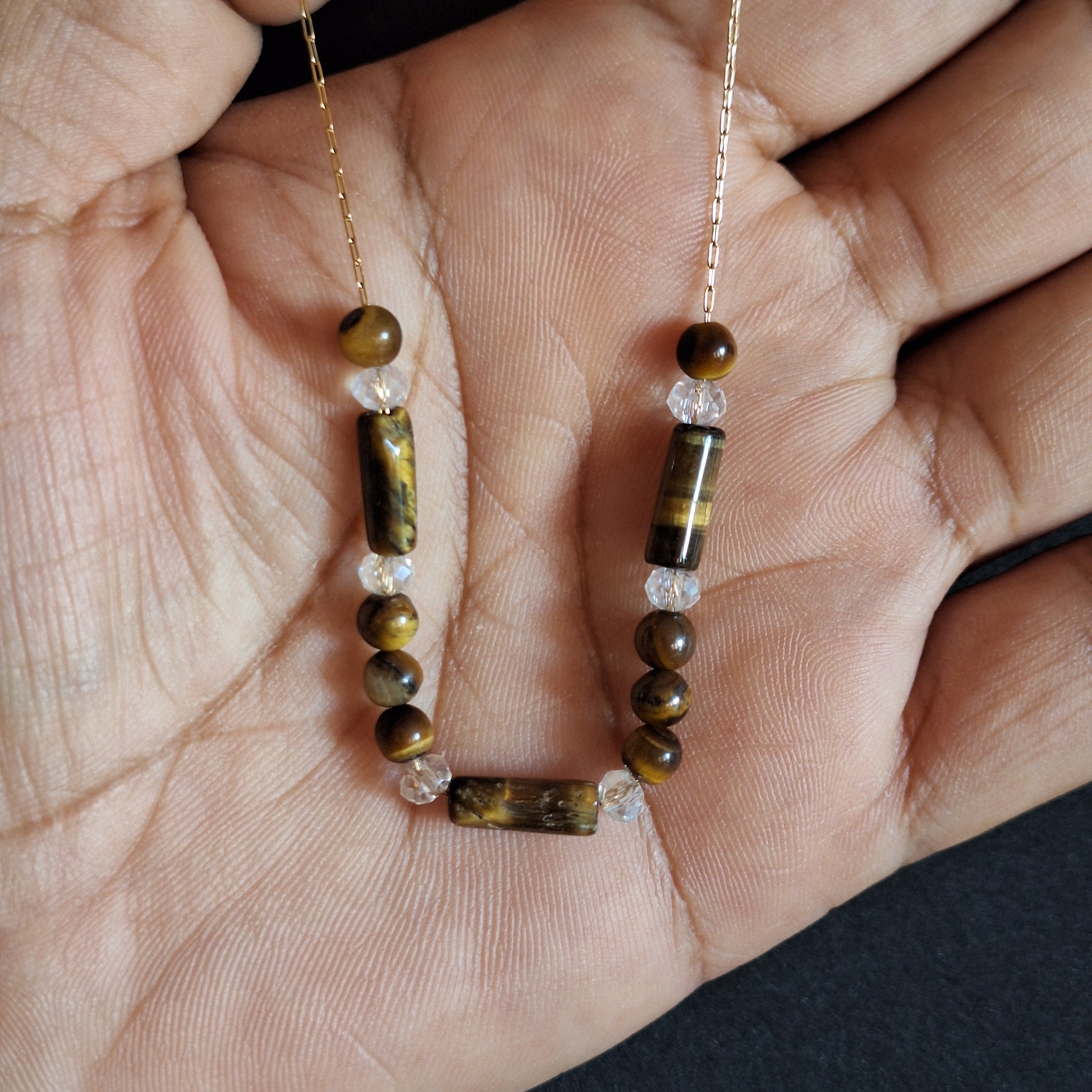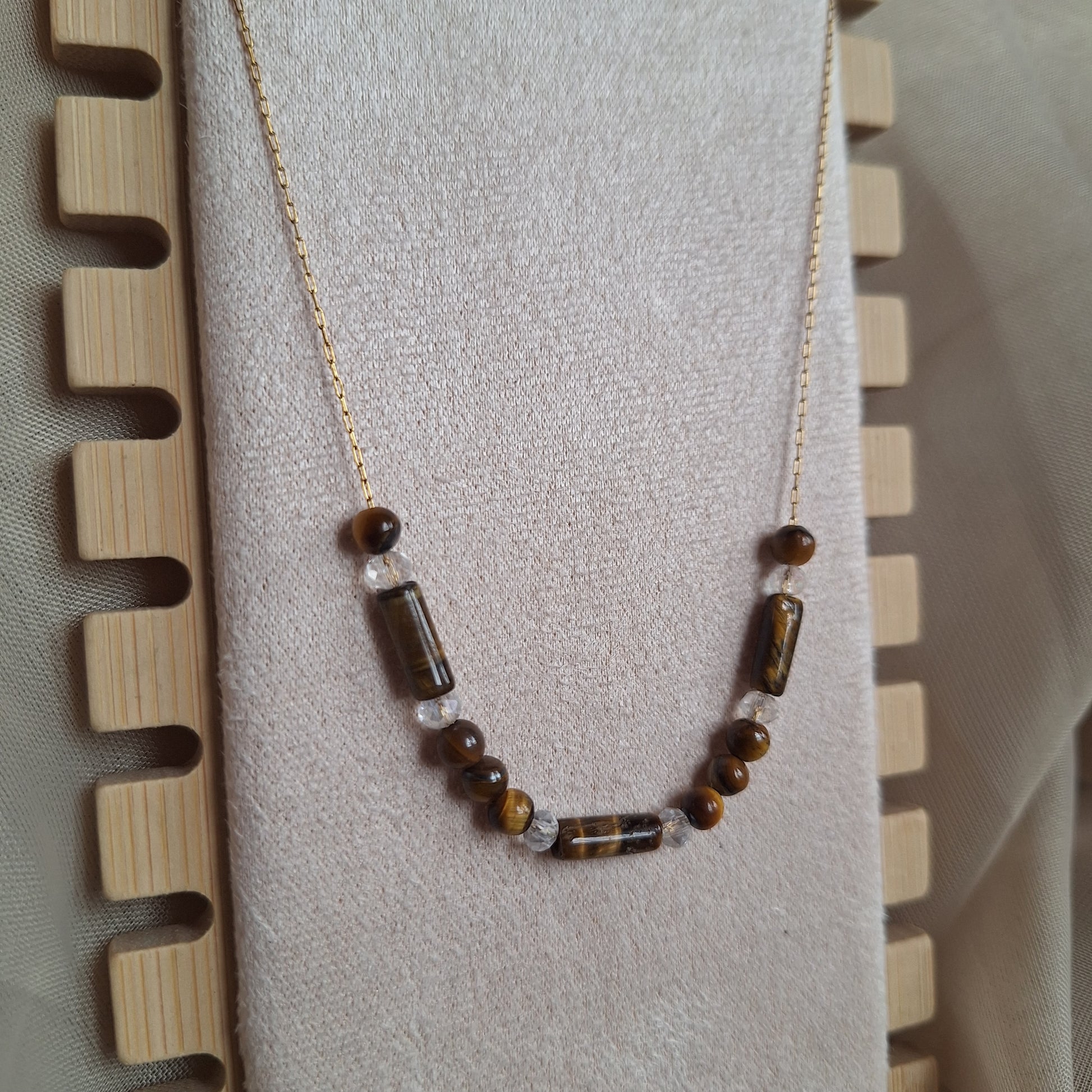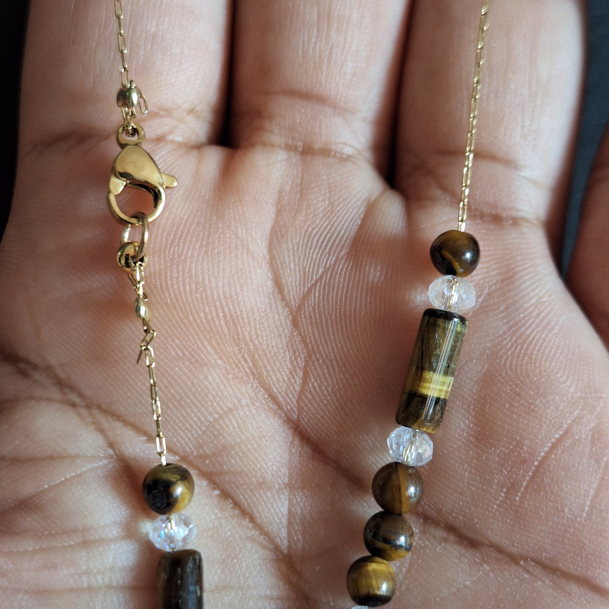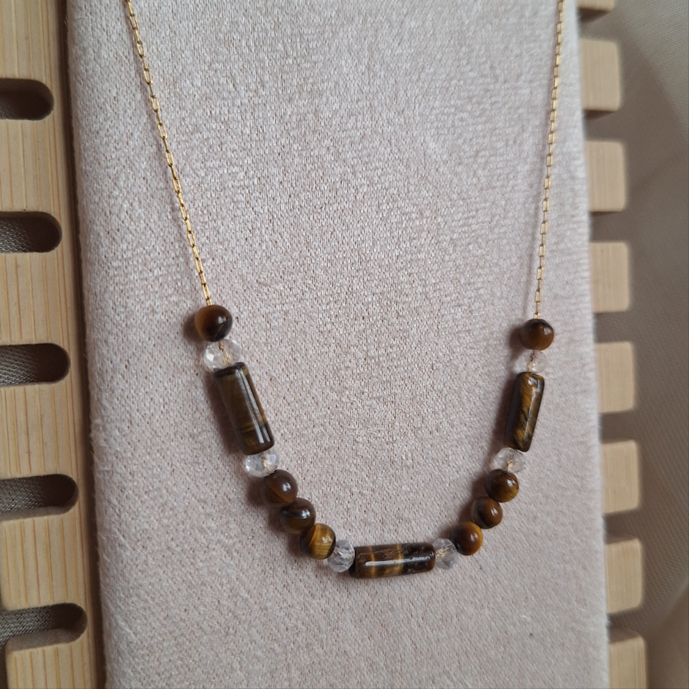 Disfruta del lujo y la elegancia con nuestro collar ojo de tigre dorado. Este collar exclusivo está hecho con el distintivo ojo de tigre dorado, brindando un toque de sofisticación y estilo a cualquier atuendo. El ojo de tigre dorado es una piedra de cuarzo con propiedades únicas. Este cristal posee un patrón de rayas doradas que reflejan la luz, lo que lo hace ideal para la meditación y la protección energética. Además, aporta estabilidad, fuerza y claridad mental para enfrentar situaciones difíciles.